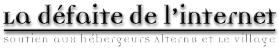 Défaite de l'Internet Le débat autour de la responsabilité des hébergeurs est complexe. Pour vous aider à comprendre cette affaire, quelques explications techniques et juridiques, quelques considérations plus générales sur le pourrissement du débat autour de la liberté d'expression sur l'Internet, la discussion des arguments foireux des partisans de la condamnation des hébergeurs... Au-dela de l'injustice qui frappe Valentin Lacambre, sa condamnation menace directement la survie du Web indépendant, et donc la liberté d'expression sur le Web. Le processus a déjà commencé : les hébergeurs censurent préventivement et à la hâte les contenus qui pourraient poser problème, sans laisser la possibilité à leurs auteurs de défendre leur expression. Et comme le montre la fermeture d'Altern, c'est la survie des hébergeurs qui est menacée. A moyen terme, c'est l'impossibilité, pour chacun, de s'exprimer librement sur le réseau." (La défaite de l'Internet) Altern.org devrait réouvrir